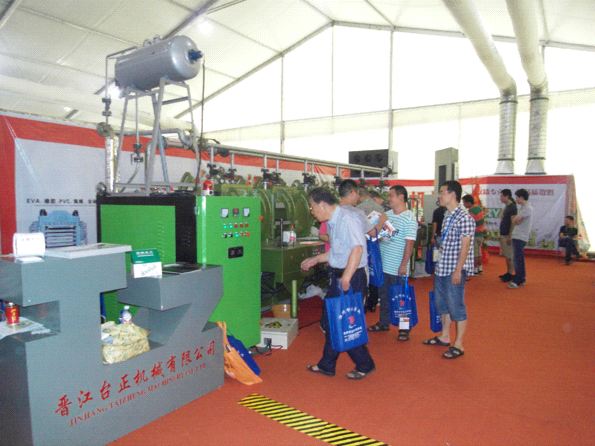 在8月30日---9月1日的浙江温州第17届皮革及鞋机鞋材展会上,台正公司携带公司最新产品----橡胶鞋底全自动油压机参展,该机械以节省人工(2个人就可操作一组机台,比传统橡胶机要节省2-4个工人);大幅度降低工人劳动强度(传统橡胶机必须是年轻体壮的男青年来操作方可胜任,该机械年老,妇女皆可操作。这一优点可以降低公司工资支出。)机械操作简单方面(机械设有手动自动两种操作方式)。这三大优点使得该机械一亮相展会就收到中外不少商家的关注。